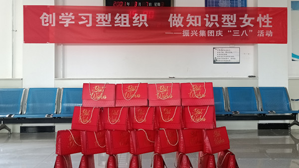 在慶祝三八婦女節(jié)儀式上,集團(tuán)公司副董事長(zhǎng)鄭龍和副總經(jīng)理蘭小偉為全體女職工發(fā)放了福利并合影。